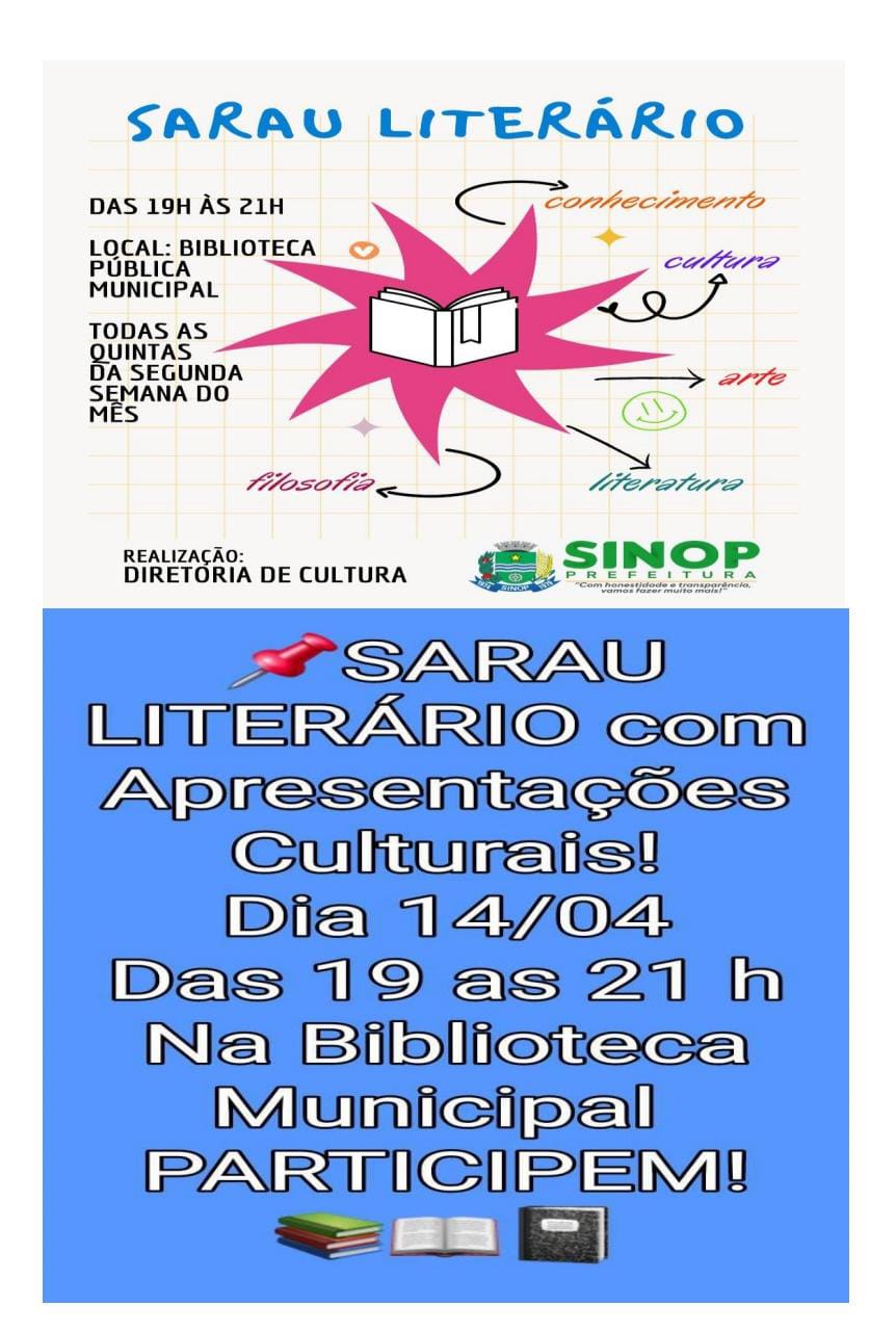 A Diretoria de Cultura e Prefeitura de Sinop-MT realiza no dia 14 de abril SARAL LITERÁRIO.