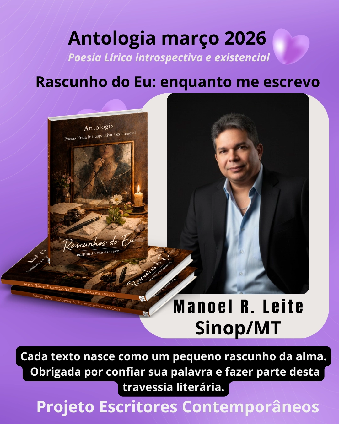 Quero agradecer ao grande ENCONTRO de LUZ com a EDITORA DESTA FAMÍLIA LITERÁRIA, um momento único e prá lá de especial, de afinidade com quem eu considero irmã de alma "Dolores Flor" por um dia nós termos parado na mesma encruzillhada da vida e deste encontro a amizade nasceu, projetos de trabalho se edificaram pelo amor a literatura e desde então Trilhamos os mesmos caminhos a busca pela valorização e pela visibilidade da literatura, em nossa cidade, em nosso país, a evolução como forma de mudança fundamental nos comportamentos humanos por meio da LEITURA e da ESCRITA para uma sociedade fundamentada no autoconhecimento. Desde 2011 já estava consgrada ESCRITORA e DIRETORA de revistas Nacionais e Internacionais com ISSN, já havia publicado muitas Revistas e escrito o primeiro livro via Grafica mas, a dificuldade de registro do ISBN era desafiador sem contar nos valores altos, devido a quantidade de exemplares por publicações, publicar era para poucos, mas de repente a AÇÕES LITERÁRIAS chegou e tudo melhou. O primeiro encontro com Dolores Flor, Manoel Leite se deu em 2028 na Academia Sinopense de Ciências e Letras.