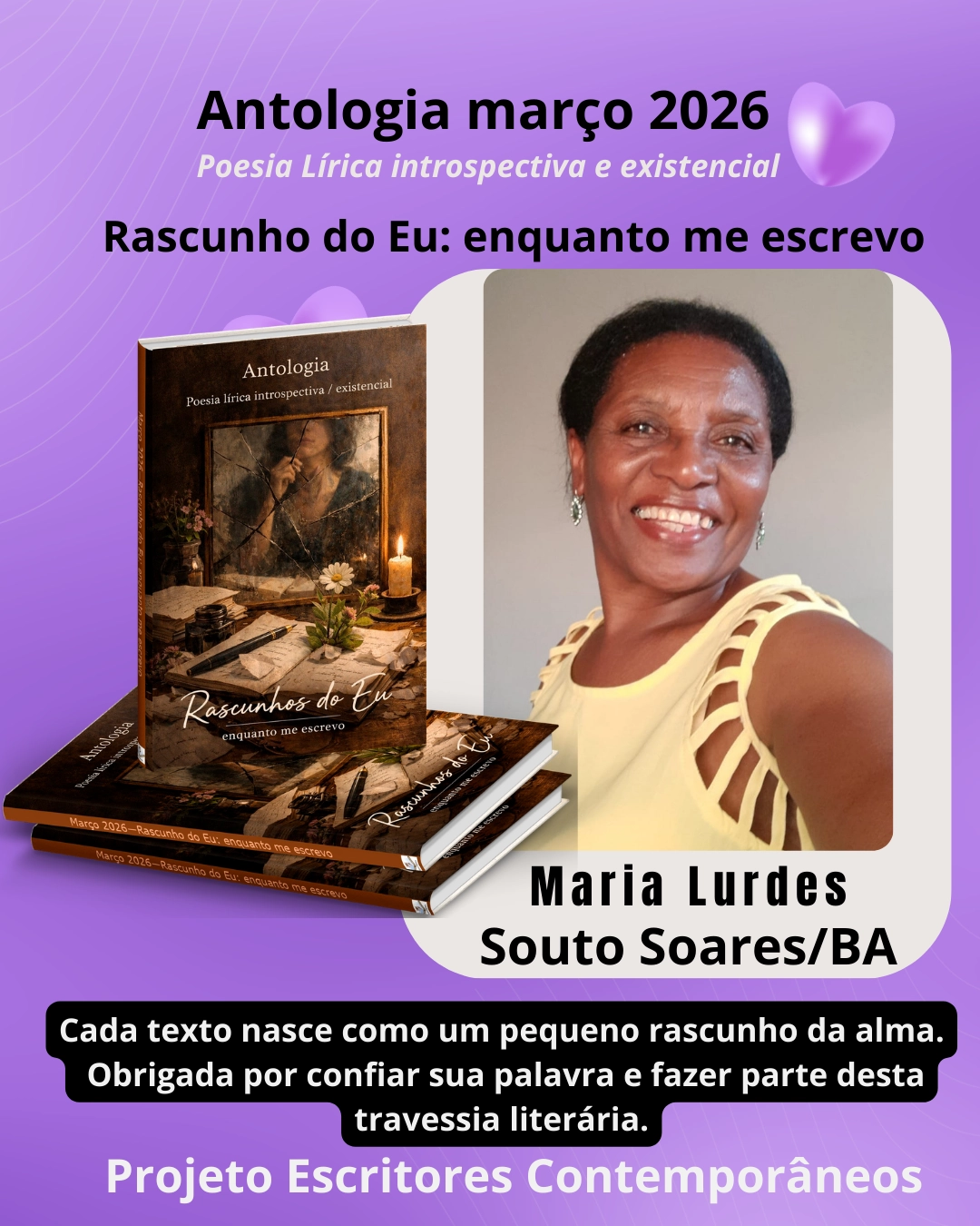 “Participar da Família Literária, fazer parte do Projeto Escritores Contemporâneos é maravilhoso. Antes eu escrevia apenas para mim, agora escrevo para outros olhos e diversos modos de pensar e analisar, e não tenho medo disso, estou aberta a qualquer crítica construtiva e incentivos literários, afinal, estou em constante aprendizagem. Hoje digo que sou escritora. Amo cada aprendizado que tenho, fazendo parte dessa família e a cada dia cresço, evoluo e amplio ainda mais o meu conhecimento.”