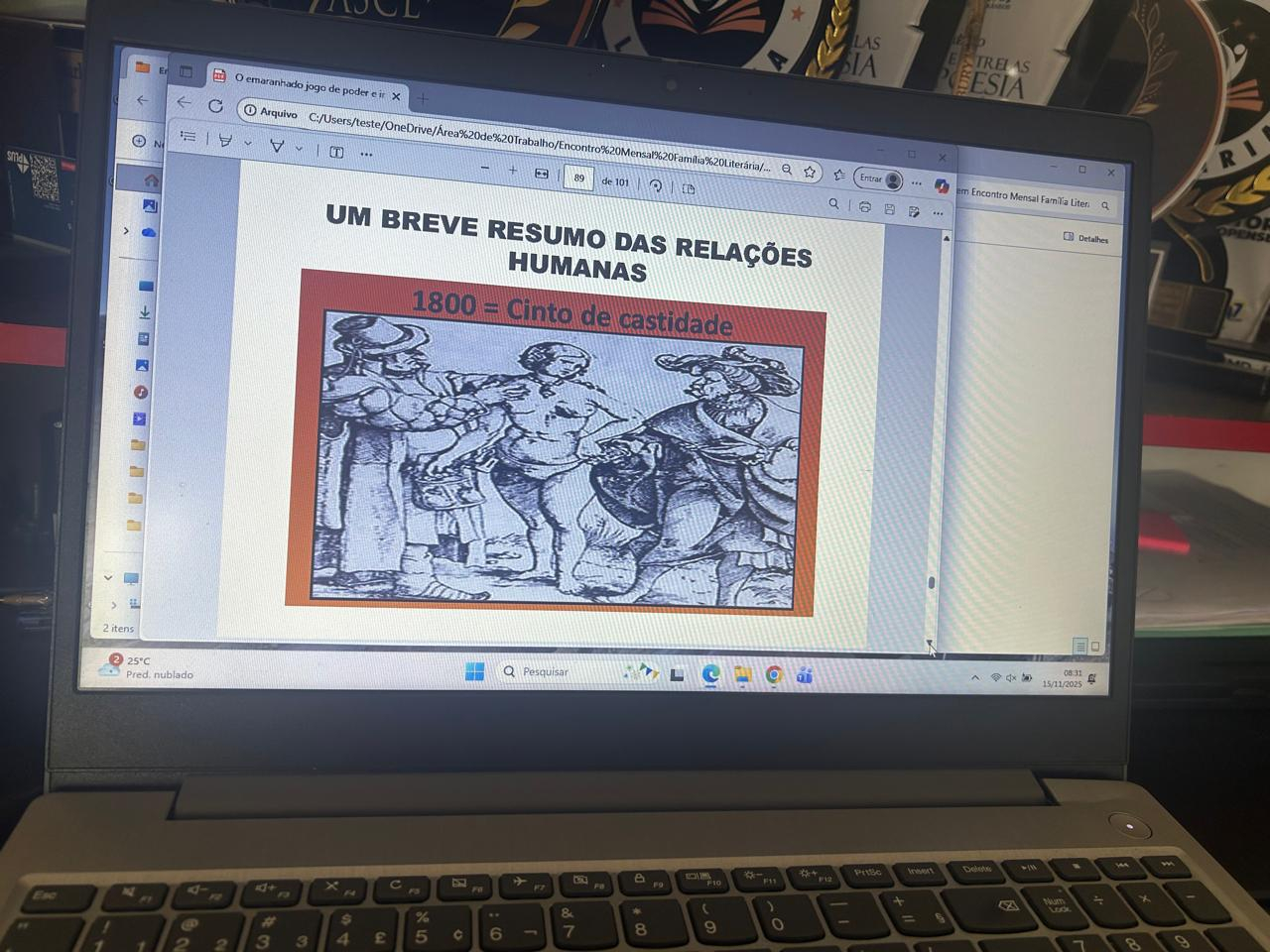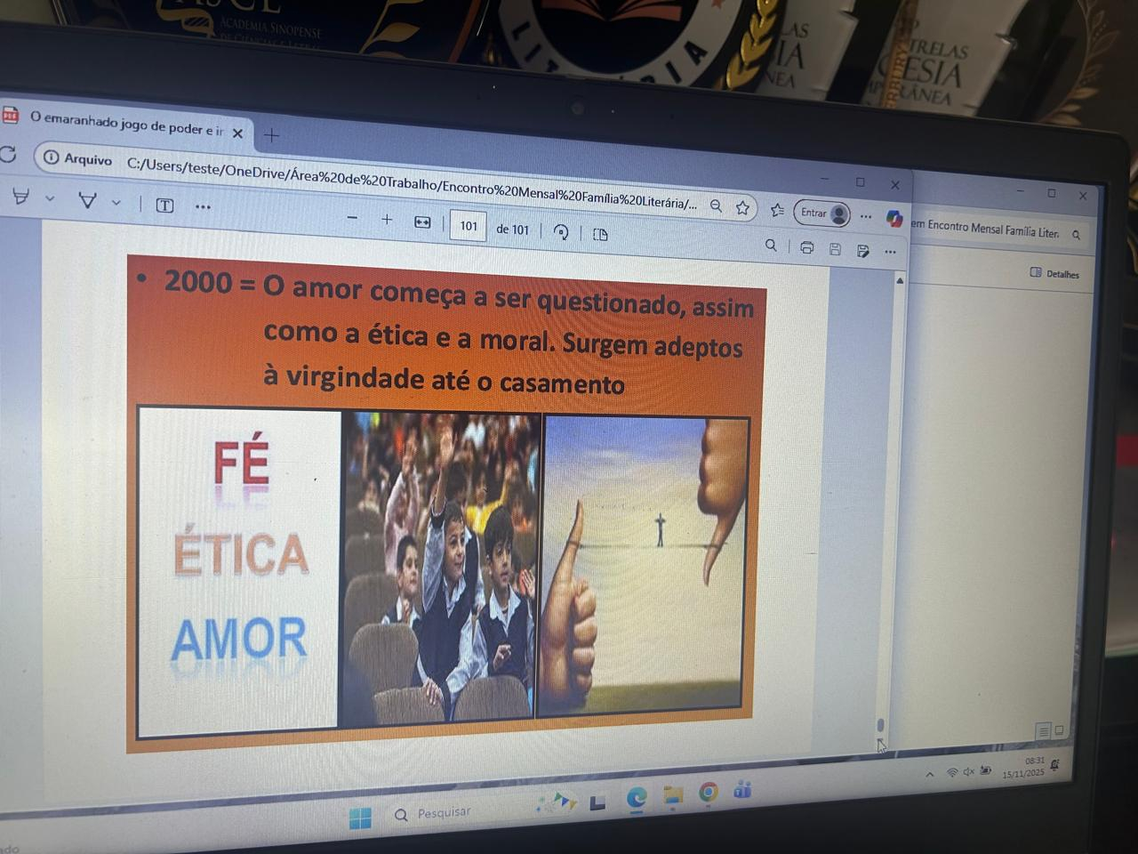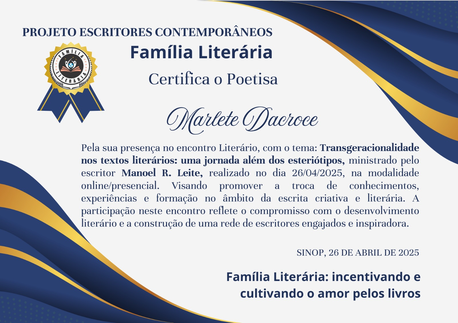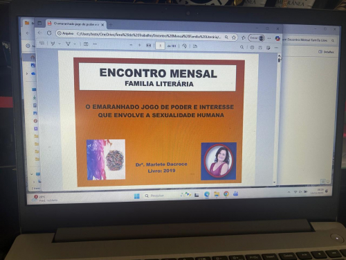Todo último sábado de cada mês é reservado um momento para a formação dos escritores contemporâneos uma ação da editora ações literárias desenvolve e interação, debates e reflexão, falar, discutir, neste dia de estudo literário com temáticas variadas dos quais os próprios escritores escolhem para falar e apresentam aos demais escritores presentes e online. dos 12 ENCONTROS de formação estive presente em 11 deles e em 02 estive ministrando FORMADORA do encontro apresentanto um livro científico "O emaranhado jogo de poder e intweresse que envolve a sexualidade humana"