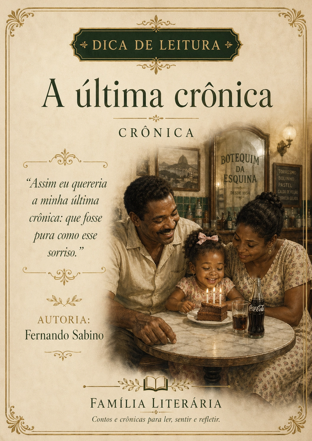 São três velinhas brancas, a mãe espeta caprichosamente na fatia do bolo. E minúsculas, que enquanto ela serve a Coca-Cola, o pai risca o fósforo e acende as velas. Como a um gesto ensaiado, a menininha repousa o queixo no mármore e sopra com força, apagando as chamas. Imediatamente põe-se a bater palmas, muito compenetrada, cantando num balbucio, a que os pais se juntam, discretos: "parabéns pra você, parabéns pra você..." Depois a mãe recolhe as velas, torna a guardá-las na bolsa. A negrinha agarra finalmente o bolo com as duas mãos sôfregas e põe-se a comê-lo. A mulher está olhando para ela com ternura - ajeita-lhe a fitinha no cabelo crespo, limpa o farelo de bolo que lhe cai ao colo. O pai corre os olhos pelo botequim, satisfeito, como a se convencer intimamente do sucesso da celebração. Dá comigo de súbito, a observá-lo, nossos olhos se encontram, ele se perturba, constrangido - vacila, ameaça abaixar a cabeça, mas acaba sustentando o olhar e enfim se abre num sorriso.